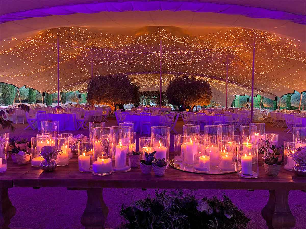 Una vez montada las dos carpas, la del banquete y la del cóctel, nos debíamos centrar en el segundo elemento clave: los postes o mástiles. Nuestro especialista en estructuras hizo los cálculos necesarios, y quedamos en que necesitaríamos, para la carpa de 21×45, 15 postes centrales para sostener los 900 kilos -casi una tonelada- de carpa. Los mástiles debían tener 6 metros de altura, para superar los 4 metros y pico de los enormes olivos de la pradera donde cenarían los comensales. También la zona del cóctel albergaba árboles que debían quedar por debajo de nuestras carpas.